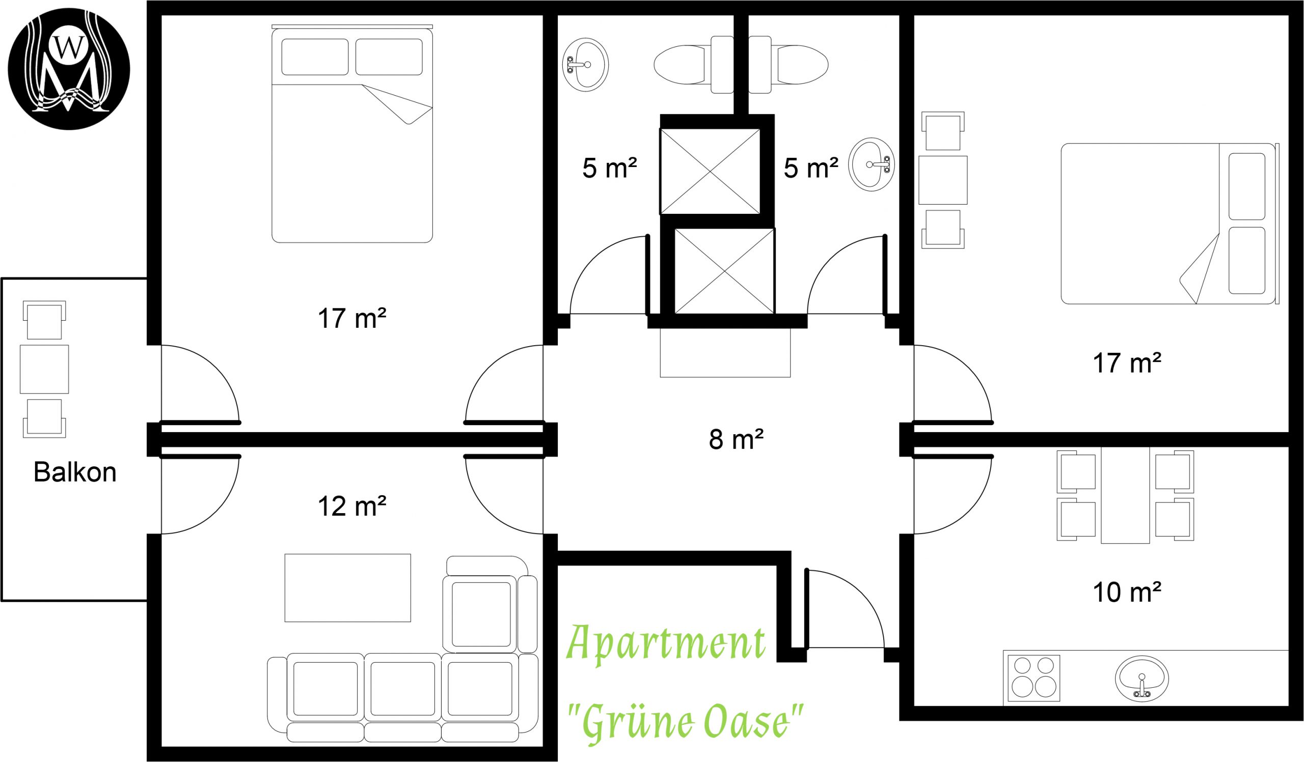 Diese geräumige, vollständig ebenerdige Wohneinheit bietet Ihnen höchsten Komfort ohne lästige Treppen – ideal für einen entspannten Aufenthalt. Sie verfügt über zwei gemütliche, separate Schlafzimmer, die jeweils mit einem komfortablen Doppelbett ausgestattet sind. Das einladende Wohnzimmer bietet zudem ein bequemes Schlafsofa und ausreichend Platz für gemeinsame Stunden.